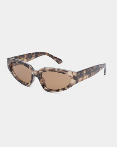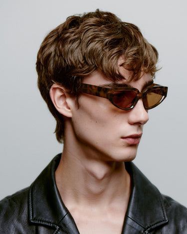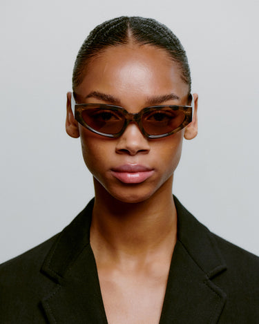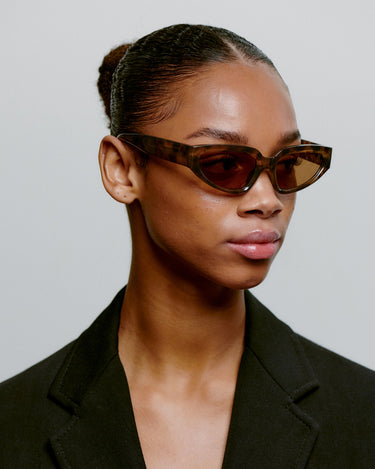 Een iets groter, klassiek maar trendy paar met smalle ovale cateye glazen in een rechtopstaand, robuust montuur met brede veren die samen een sterke maar vrouwelijke look creëren.