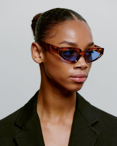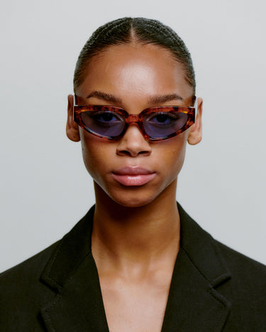 Een iets groter, klassiek maar trendy paar met smalle ovale cateye glazen in een rechtopstaand, robuust montuur met brede veren die samen een sterke maar vrouwelijke look creëren.